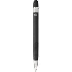 Notatnik ok A5, 100 stron w linie (70 g/m²) z twardą okładką przypominającą sztruks, tasiemka zakładkowa umożliwia wygodne zaznaczanie ostatniej strony lub ważniejszych notatek, długopis w komplecie, gumowe wykończenie, paskowane detale na trzonie i w górnej części, chromowana plastikowa końcówka, ikona recyklingu na obu produktach, zapakowane w brązowe kartonowe pudełko, produkt wykonany z PU i metalu