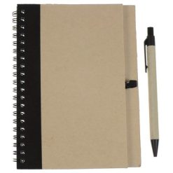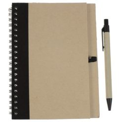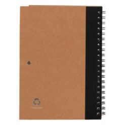 Notatnik w formacie ok. A5, posiada 60 kartek w linie (120 stron) i spiralne bindowanie, w komplecie znajduje się długopis z kolorowymi elementami, wkład w niebieskim kolorze, okładka wykonana z kartonu z kolorowym elementem przy bindowaniu