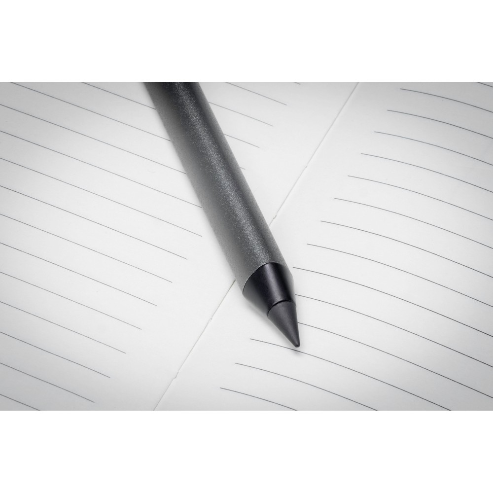 Notatnik w formacie A5, 70 g/m², posiada 70 kartek w linie, tasiemka zakładkowa umożliwia wygodne zaznaczanie ostatniej strony lub ważniejszych notatek, dodatkowe zamknięcie w postaci dopasowanej kolorystycznie elastycznej opaski, sznurek do przywiązania długopisu, ikona recyklingu z tyłu, produkt wykonany z RPET 600D i papieru