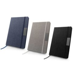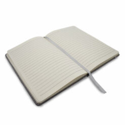 Notatnik w formacie A5, posiada 80 kartek w linie (160 stron), dodatkowe zamknięcie w postaci dopasowanej kolorystycznie elastycznej opaski, posiada metalowy element na grawerunek logotypu lub hasła, twarda okładka wykonana z RPET