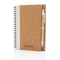 Notatnik (70 kremowych kartek z papieru makulaturowego 70 g/m2 w linie), korkowa okładka, spiralne bindowanie, dopasowany kolorystycznie długopis z papieru kraftowego w komplecie, niemiecki wkład Dokumental® w kolorze niebieskim w komplecie, długość pisania ok. 600 m, ślad węglowy produktu: 0,34 kg CO2