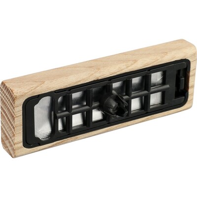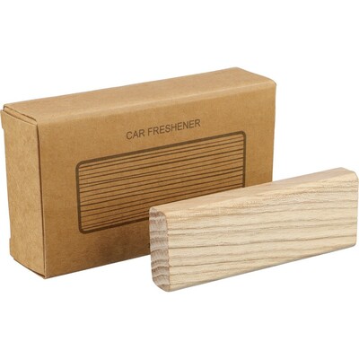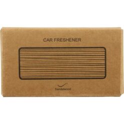 Odświeżacz do samochodu, 2 pojemniczki z zapachem drzewa sandałowego po 3 g, klips ułatwiający przypięcie w samochodzie, zapakowany pojedynczo w brązowy kartonik, produkt wykonany z drewna bukowego