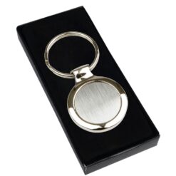 Okrągły brelok do kluczy z dedykowanym miejscem pod znakowanie, grawer ukazuje kolorową powierzchnię, czarne pudełko podarunkowe w komplecie, produkt wykonany z metalu