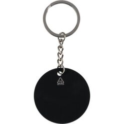 Okrągły brelok do kluczy w kształcie piłki nożnej, ikona recyklingu na produkcie, zapakowany w kraftową kopertę, produkt wykonany ze stali nierdzewnej z recyklingu