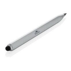 Ołówek, linijka, touch pen, wykonany aluminium z recyklingu, dzięki wykorzystaniu specjalnej wolnościerającej się grafitowej końcówki długość pisania ołówka to około 20 000 metrów w porównaniu z tradycyjnym ołówkiem którego długość pisania to około 200 metrów, notatki można zmazać standardową gumką do mazania, ślad węglowy produktu: 0,1 kg CO2