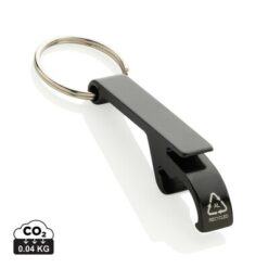 Otwieracz do butelek i puszek, wykonany z aluminium z recyklingu, całkowita zawartość materiałów z recyklingu obliczona w oparciu o wagę całkowitą przedmiotu: 79%