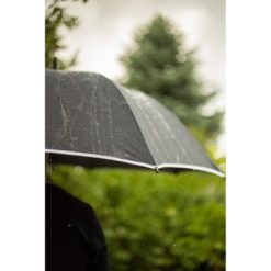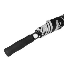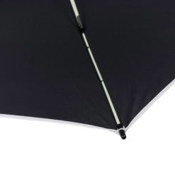 Parasol automatyczny z białymi elementami, 8 paneli z białą lamówką, piankowa rączka, biały przycisk, metalowa rama w białym kolorze, białe żebrowanie z włókna szklanego, zapięcie na rzep