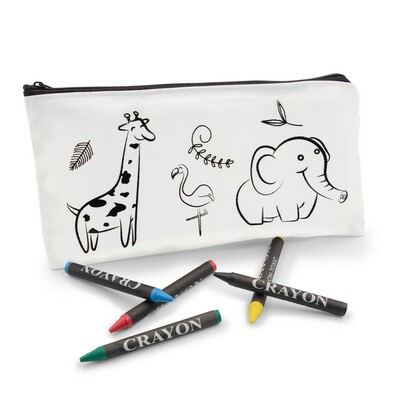 Piórnik zaprojektowany do kolorowania, posiada 5 kredek świecowych w różnych kolorach w komplecie, produkt wykonany z materiału non-woven