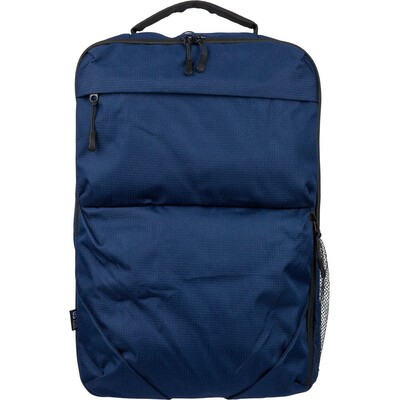 Plecak na laptopa 15″ o pojemności 20 litrów, kieszeń główna zapinana na zamek, przegroda na laptopa 15″, dwie małe kieszenie przednie zapinane na zamek, uchwyt ułatwiający noszenie, kieszeń boczna z siatką, wentylowane paski do noszenia na ramieniu, pasek do przymocowania do walizki, ikona OBP na metce, produkt wykonany z RPET 300D