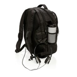 Plecak na laptopa 15,6″, wykonany z poliestru 1680D, posiada kieszenie na rzeczy osobiste, miękką przegrodę na laptopa, miejsce na tablet i przybory do pisania, kieszenie siateczkowe, miejsce do podłączenia słuchawek oraz uchwyt na okulary przeciwsłoneczne w pasku na ramię, pokrowiec przeciwdeszczowy w komplecie, produkt zastrzeżony®, ślad węglowy produktu: 10,16 kg CO2