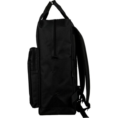 Plecak, podszewka z poliestru 210D, główna kieszeń zapinana na zamek, wewnętrzna przegroda na laptopa 16″, mniejsza przednia kieszeń zapinana na zamek, regulowane i wentylowane paski do noszenia, pasek do przymocowania do walizki, kieszenie boczne po obu stronach, produkt wykonany z poliestru 600D z recyklingu