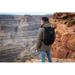 Plecak zwijany BrandCharger Venturer, wykonany z butelek PET pochodzących z recyklingu, elegancki wygląd, przestronna komora główna, kilka elastycznych kieszeni, wyściełana przegroda na laptopa 16″, lekki i wyposażony w oszczędzający miejsce system rolek, sprawdzi się w codziennych dojazdach do pracy, podczas podróży lub krótkich wycieczek, wyposażony w odblaskowe sznuki, regulowany pasek na ramię, zwijane zapięcie, wentylowane paski na ramiona, wodoodporny i odporny na plamy materiał, produkt wykonany z RPET i poliestru