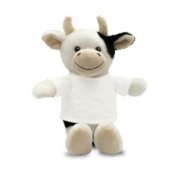 Krówka z białą koszulką pod nadruk (nieoznakowana koszulka pakowana oddzielnie), wykonana z pluszu pochodzącego z poddanych recyklingowi butelek PET, zgodna z certyfikatem GRS (Global Recycled Standard)