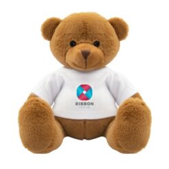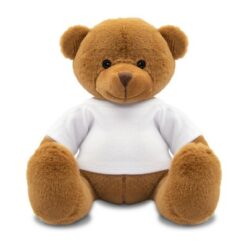 Brązowy miś z białą koszulką pod nadruk, nieoznakowana koszulka z poliestru jest pakowana oddzielnie, produkt wykonany z pluszu