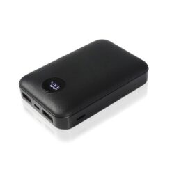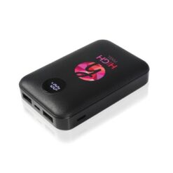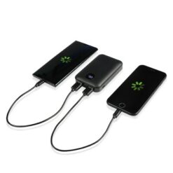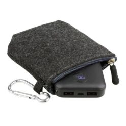 Power bank Air Gifts 10000 mAh, może zmieścić się w kieszeni czy większości przegródek w plecaku, posiada cyfrowy wyświetlacz poziomu naładowania, wejścia 5V/2A: USB-C oraz micro USB, 2 wyjścia USB (max. 5V/2A), możliwość ładowania dwóch urządzeń jednocześnie, w komplecie kabel USB-C oraz filcowe etui z karabińczykiem umożliwiającym przypinanie, produkt wykonany z ABS i filcu