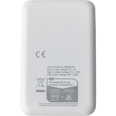 Power bank o mocy 22,5W i pojemności 10000 mAh z baterią litowo-jonową, wejście i wyjście typu C, wejście typu A, etykieta informacyjna z tyłu, ikona RABS na produkcie, posiada zabezpieczenie przed przegrzaniem, zwarciem, przepięciem i przeciążeniem, zapakowany pojedynczo w brązowe kartonowe pudełko, produkt wykonany z ABS z recyklingu
