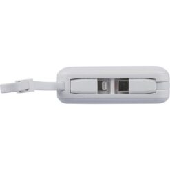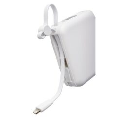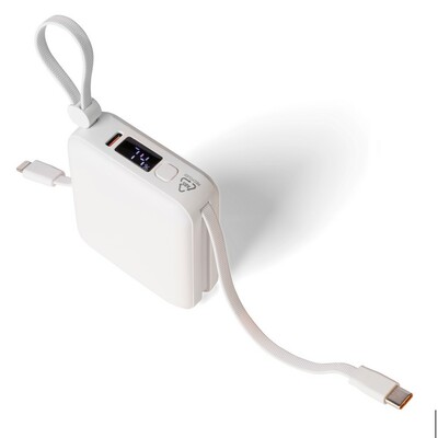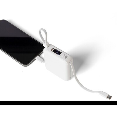 Power bank 10000 mAh, 22,5W, zestaw zawiera sznurek do przenoszenia z TPE (zintegrowany z obudową), który pełni również funkcję kabla do ładowania (USB-C i z końcówką kompatybilną z urządzeniami iOS), wskaźnik poziomu baterii na górnej części urządzenia, ikona RABS na produkcie, wejście i wyjście USB-C, wejście USB-A, w środku pudełka bibułka ochronna, bez woreczka foliowego, zawiera zabezpieczenia przed przegrzaniem, zwarciem, przepięciem i przeciążeniem prądowym, pakowany pojedynczo w brązowe pudełko kartonowe, produkt wykonany z recyklingowego ABS z baterią litowo-jonową