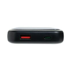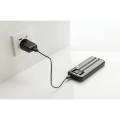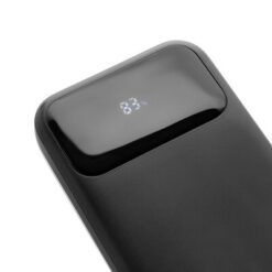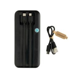 Power bank 10000 mAh, szybkie ładowanie, zintegrowane kable USB-C i Apple Lightning, dodatkowy port USB-C oraz USB-A, możliwość naładowania telefonu do czterech razy, cyfrowy wyświetlacz poziomu energii, wykonany z recyklingowanego ABS i TPE, zawartość materiałów z recyklingu: 21%, certyfikacja RCS, opakowanie z papieru kraft z certyfikatem FSC®, wolny od PVC, różnorodne napięcia i natężenia wyjściowe dla portów USB-A, USB-C i kabli wbudowanych