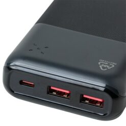 Power bank o mocy 22,5W i pojemności 20000 mAh z baterią litowo-jonową, wejście i wyjście typu C, wejście typu A, etykieta informacyjna z tyłu, ikona RABS na produkcie, posiada zabezpieczenie przed przegrzaniem, zwarciem, przepięciem i przeciążeniem, zapakowany pojedynczo w brązowe kartonowe pudełko, produkt wykonany z ABS z recyklingu