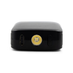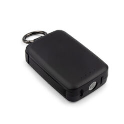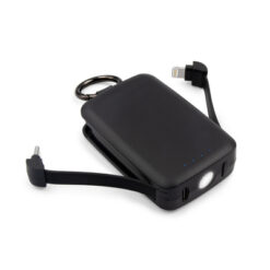Power bank 4000 mAh z karabińczykiem umożliwiającym przypinanie, może zmieścić się w kieszeni czy większości przegródek w plecaku, posiada wbudowaną lampkę o mocy 1W i 3 trybami świecenia: światło stałe (2 tryby) i światło migające (komunikat typu SOS), światło stałe słabsze, 2 zintegrowane kable: USB-C i z końcówką kompatybilną z urządzeniami iOS co umożliwia jednoczesne ładowanie dwóch urządzeń o różnych złączach, posiada 4 diody wskazujące poziom naładowania, czas działania lampki na 1 cyklu ładowania power banku: > 24h, wejście USB-C, w komplecie kabel USB-C, produkt wykonany z ABS i metalu