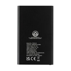 Power bank 4000 mAh, wskaźniki poziomu naładowania, wbudowany akumulator litowo-polimerowy klasy A, wykonany z aluminium i ABS z recyklingu, całkowita zawartość materiałów obliczona na podstawie wagi całkowitej przedmiotu: 66%, wejście USB typu C 5V/2A, wyjście USB typu C 5V/2A, wyjście USB 5V/2A, kabel z TPE z recyklingu z certyfikatem RCS w komplecie, w pudełku z papieru z certyfikatem FSC® mix, ślad węglowy produktu: 1,83 kg CO2