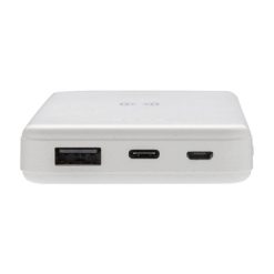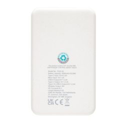 Bezprzewodowy power bank 5000 mAh, ładowarka bezprzewodowa 5W, diody wskazujące poziom naładowania, wykonany z ABS z recyklingu z certyfikatem RCS, całkowita zawartość materiałów z recyklingu obliczona na podstawie wagi całkowitej przedmiotu: 26%, wbudowany akumulator litowo polimerowy o dużej gęstości, wejście micro USB 5V/2A, wejście USB typu C 5V/2.4A, wyjście USB typu C 5V/2.4A, wyjście USB 5V/2.4A, kabel z TPE z recyklingu z certyfikatem RCS w komplecie, w pudełku z papieru kraftowego z certyfikatem FSC® mix, ślad węglowy produktu: 2,31 kg CO2