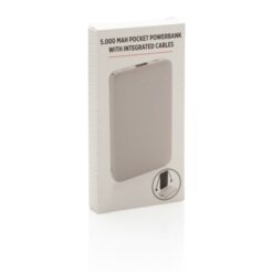 Power bank 5000 mAh, zintegrowany kabel 3 w 1 z TPE, kompatybilny z większością urządzeń dostępnych na rynku, kieszonkowy rozmiar, wykonany z ABS, wskaźniki poziomu naładowania, wbudowany akumulator litowo-polimerowy klasy A o dużej gęstości i trwałości pozwala naładować telefon do 2 razy, wejście 5V/2A, wyjście 5V/2A, ślad węglowy produktu: 1,99 kg CO2