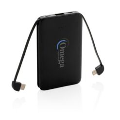 Power bank 5000 mAh, zintegrowany kabel 3 w 1 z nadrukiem Twojego logo, materiał: plastik, kolor: czarny