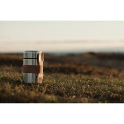 Próżniowy pojemnik na żywność, wykonany ze stali nierdzewnej, opaska oraz drewniana łyżka w komplecie