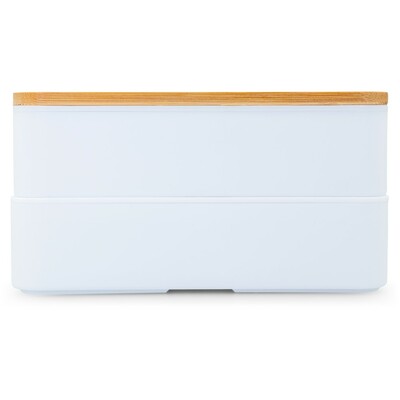Pudełka śniadaniowe 2 w 1, 2×400 ml, bambusowe wieczko, sztućce z nadrukiem Twojego logo, materiał: plastik, bambus, pp, kolor: biały