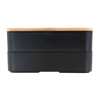 Pudełka śniadaniowe 2 w 1, 2×500 ml, bambusowe wieczko, sztućce | Tijani z nadrukiem Twojego logo, materiał: guma, bambus, pp, kolor: czarny