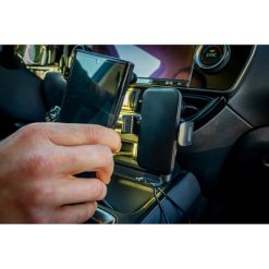 Samochodowy uchwyt do telefonu, ładowarka bezprzewodowa 15W, działa z telefonami posiadającymi możliwość ładowania indukcyjnego, funkcja szybkiego ładowania, mocowanie do wentylacji, 2 przyciski sensoryczne do sterowania zaciskami, funkcja umożliwiająca wyjęcie telefonu po odcięciu zasilania, zasięg ładowania bezprzewodowego do 6 mm, wejście USB-C 5V/2A, 9V/2A (max), wyjście bezprzewodowe 5V/1A, 9V/1.12A, 9V/1.67A, 100 cm kabel USB-C w komplecie