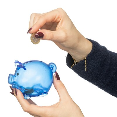 Skarbonka „świnka” z nadrukiem Twojego logo, materiał: plastik, kolor: niebieski