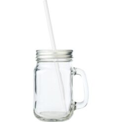 Słoik do picia 480 ml ze słomką, rączką i srebrnym wieczkiem z otworem na słomkę