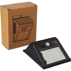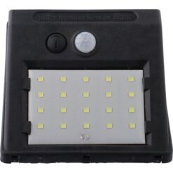 Solarna lampa ścienna LED z 20 diodami COB, wyposażona w czujnik zmierzchu (CDS) oraz czujnik ruchu (PIR), posiada wbudowaną baterię o pojemności 800 mAh, kabel do ładowania w zestawie, klasa szczelności IP44, funkcja światła stałego lub migającego, pakowana pojedynczo w brązowe kartonowe pudełko, produkt wykonany z PP