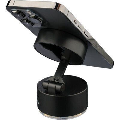 Stojak na telefon MagSafe z funkcją blokady przyssawki na spodzie, zestaw zawiera metalowy pierścień, dzięki czemu pasuje do wszystkich telefonów, ikona recyklingu na produkcie, zapakowany pojedynczo w brązowe kartonowe pudełko produkt wykonany z recyklingowego ABS