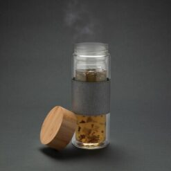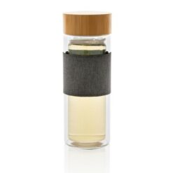 Szklana butelka 360 ml w pokrowcu z RPET, podwójne ścianki ze szkła borokrzemowego odpornego na wysoką temperaturę, 2% zysku ze sprzedaży każdego produktu jest przekazywane do fundacji Water.org, wzór zastrzeżony®