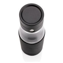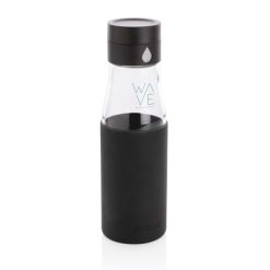 Szklana butelka 650 ml Ukiyo, monitorująca ilość wypitej wody z nadrukiem Twojego logo, materiał: szkło, silikon, kolor: czarny