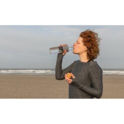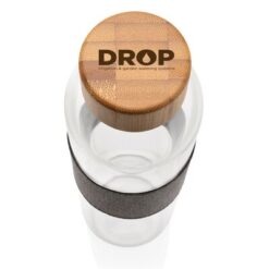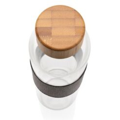 Szklana butelka 750 ml w pokrowcu z RPET, wykonana z wysokiej jakości szkła borokrzemowego odpornego na zmiany temperatury, szczelna zakrętka z bambusa, 2% zysku ze sprzedaży każdego produktu jest przekazywane do fundacji Water.org