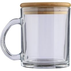 Szklany kubek 300 ml, bambusowa pokrywka, która może służyć jako podstawka, zapakowany w brązowy kartonik, produkt wykonany ze szkła z recyklingu