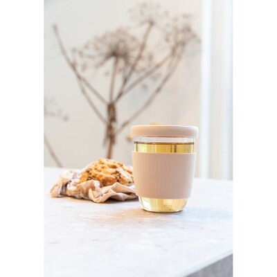 Szklany kubek podróżny Ukiyo 360 ml, wykonany ze szkła borokrzemowego, silikonowy uchwyt, wieczko z otworem zapobiegającym zbieraniu się ciśnienia, ślad węglowy produktu: 0,77 kg CO2