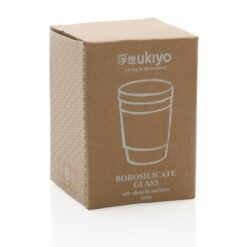 Szklany kubek podróżny Ukiyo 360 ml, wykonany ze szkła borokrzemowego, silikonowy uchwyt, wieczko z otworem zapobiegającym zbieraniu się ciśnienia, ślad węglowy produktu: 0,77 kg CO2