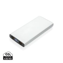 Power bank 10000 mAh, wyjście szybkiego ładowania PD (power delivery) 18W, diody wskazujące poziom naładowania, wykonany z aluminium, wbudowany akumulator litowo-polimerowy klasy A o dużej gęstości i trwałości, w pełni naładowane urządzenie może naładować telefon do 5 razy, wejście micro USB 5V/2A, wejście USB typu C 5V/3A, 9V/2A, 12V/1.5A, wyjście USB 5V/2.1A, wyjście QC 3.0 5V/3A, 9V/2A, 12V/1.5A, wyjście USB typu C 5V/3A, 9V/2A, 12V/1.5A 18W max (PD 3.0), wyjście USB 5V/3A, 9V/2A, 12V/1.5A 18W max (PD 3.0), kabel micro USB z TPE bez dodatku PVC w komplecie, ślad węglowy produktu: 4,82 kg CO2