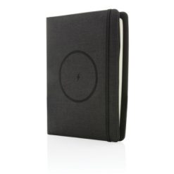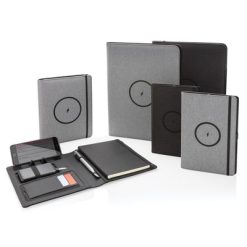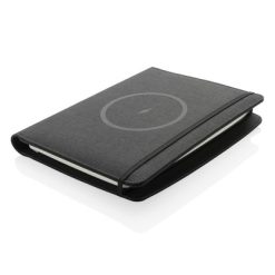 Teczka konferencyjna A5 wykonana z rPET, bezprzewodowy power bank 5000 mAh, ładowarka bezprzewodowa 5W na przedniej stronie okładki, port USB do ładowania urządzeń za pomocą kabla, bezprzewodowe ładowanie jest kompatybilne ze wszystkimi urządzeniami posiadającymi możliwość ładowania indukcyjnego, wejście 5V/2.1A, wyjście 1: 5V/2.1A, wyjście 2: 5V/2.1A, wyjście bezprzewodowe 5W, wzór zastrzeżony®, ślad węglowy produktu: 4,45 kg CO2