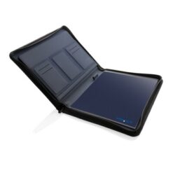 Teczka konferencyjna A4 z notatnikiem (20 kremowych kartek 80 g/m2 z papieru z recyklingu w linie), zamykana na zamek błyskawiczny, wewnątrz duża kieszeń, kieszeń na telefon oraz 2 dodatkowe kieszenie, 4 miejsca na karty kredytowe i pętla na akcesoria do pisania, tkanina zewnętrzna i wewnętrzna z poliestru AWARE™ RPET, który został wykonany z butelek PET pochodzących z recyklingu z identyfikowalnym źródłem, produkt został wykonany z 10 butelek plastikowych poddanych recyklingowi, 2% zysku ze sprzedaży każdego jest przekazywane do fundacji Water.org, w ozdobnym, kraftowym pudełku