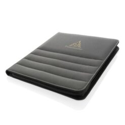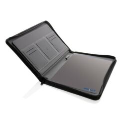 Teczka konferencyjna A4 z notatnikiem (20 kremowych kartek 80 g/m2 z papieru z recyklingu w linie), zamykana na zamek błyskawiczny, wewnątrz duża kieszeń, kieszeń na telefon oraz 2 dodatkowe kieszenie, 4 miejsca na karty kredytowe i pętla na akcesoria do pisania, tkanina zewnętrzna i wewnętrzna z poliestru AWARE™ RPET, który został wykonany z butelek PET pochodzących z recyklingu z identyfikowalnym źródłem, produkt został wykonany z 10 butelek plastikowych poddanych recyklingowi, 2% zysku ze sprzedaży każdego jest przekazywane do fundacji Water.org, w ozdobnym, kraftowym pudełku