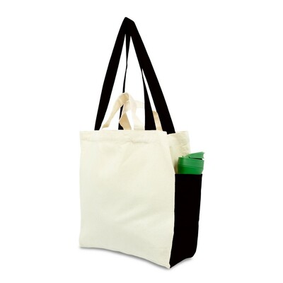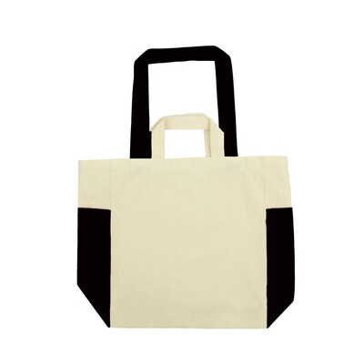 Torba na zakupy, posiada krótkie uchwyty oraz długie uchwyty umożliwiające noszenie na ramieniu, 2 kieszenie boczne dopasowane kolorystycznie do długich uchwytów, produkt wykonany z bawełny o gramaturze 240 g/m2