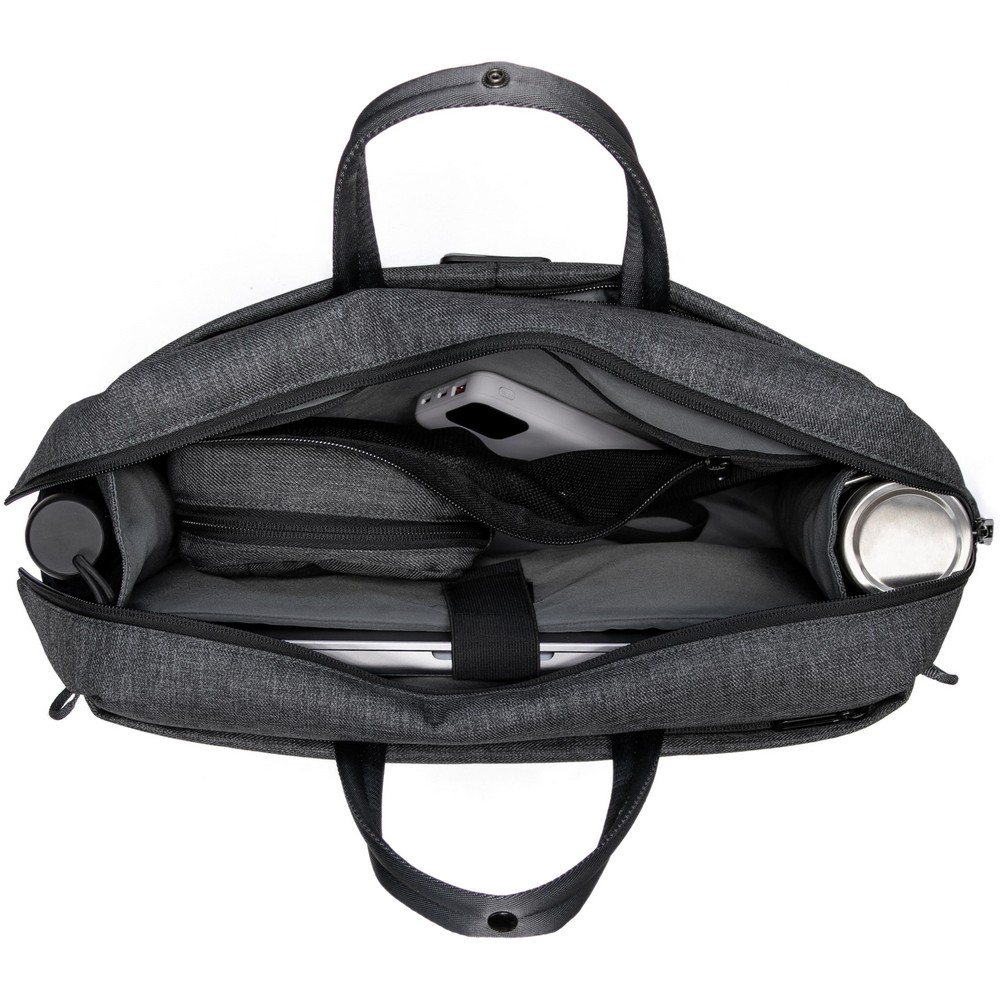 Torba na laptopa 16″ BrandCharger Metro, torba16″, wodoodporna, posiada uchwyty, pasek na ramię oraz pasek do zamocowania na walizce, 3 sposoby noszenia – w dłoni, na ramieniu i wzdłuż tułowia, przestronna przegroda główna zamykana na zamek z kieszeniami wewnątrz, kieszeń z boku na drobne akcesoria, produkt wykonany z RPET