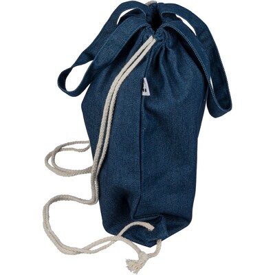 Torba na zakupy, worek ze sznurkiem, posiada długie uchwyty umożliwiające noszenie na ramieniu (2,5 x 50 cm), ikona recyklingu, produkt wykonany z dżinsu z recyklingu