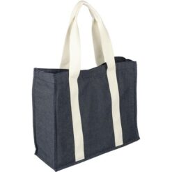 Torba na zakupy z denimu, długie płócienne uchwyty (długość 120 cm, szerokość 35 mm i grubość 2 mm – 280 g/m²), guzik do zamykania torby, produkt wykonany z denimu, poliestru i bawełny